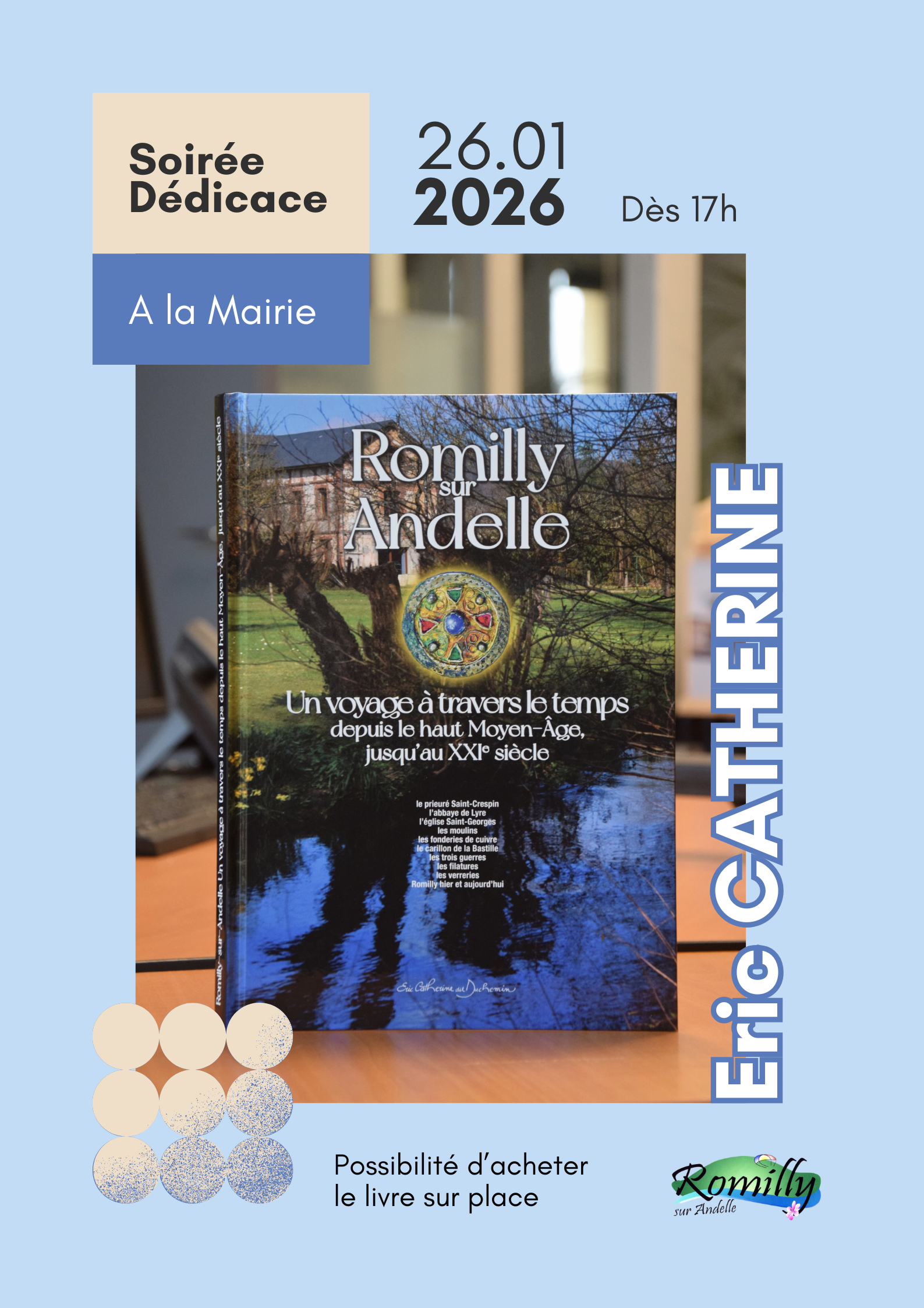 L’écrivain Eric Catherine sera à la mairie lundi 26 janvier 2026, à partir de 17h, pour une soirée dédicace de son livre « Romilly sur Andelle, un voyage à travers le temps ». Ne manquez pas ce rendez-vous littéraire.